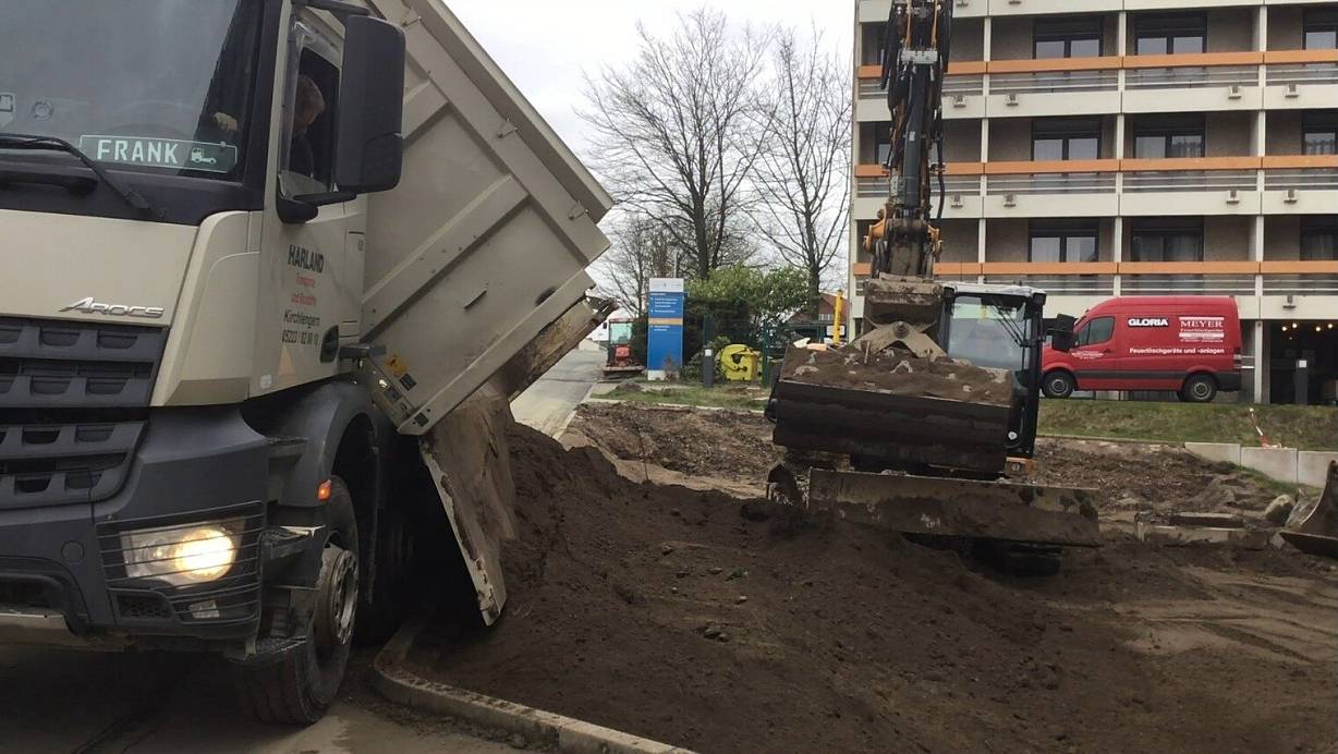 Lastwagen mit Oberboden wurden in den vergangenen Tagen angeliefert. Die Erde ersetzt Schotter und Steine, die der Baggerfahrer aus der Fläche geholt hat. | © Corina Lass