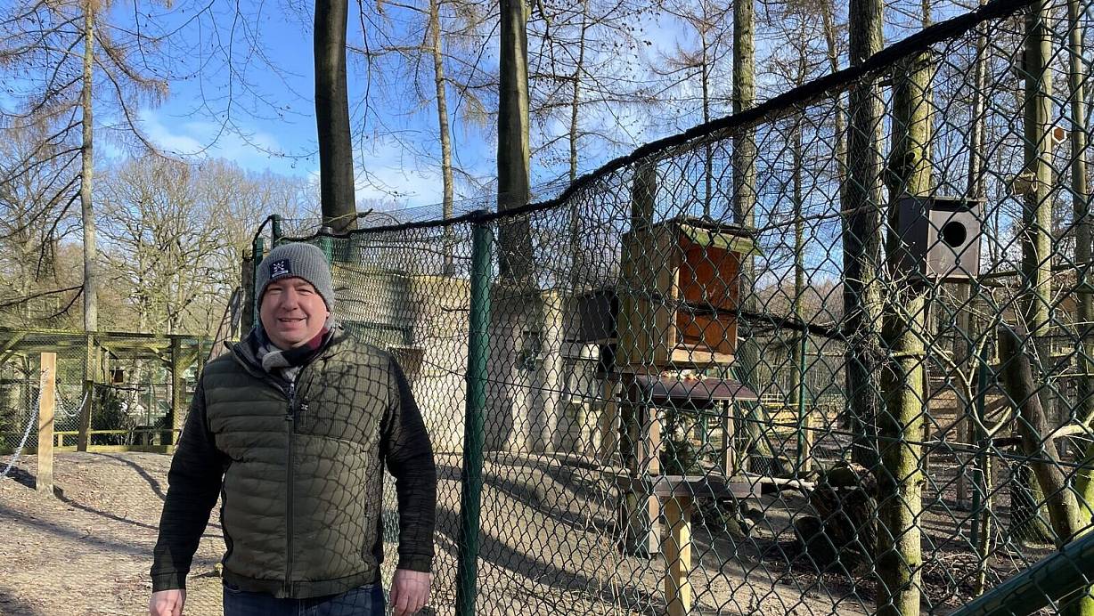 Thorsten Dodt neben der Voliere, aus der die Waldkäuze beim Sturm entflogen sind. Jetzt gibt es erste Bilder von einem der Vermissten, die mit einer Wildkamera aufgenommen wurden. | © Natalie Gottwald
