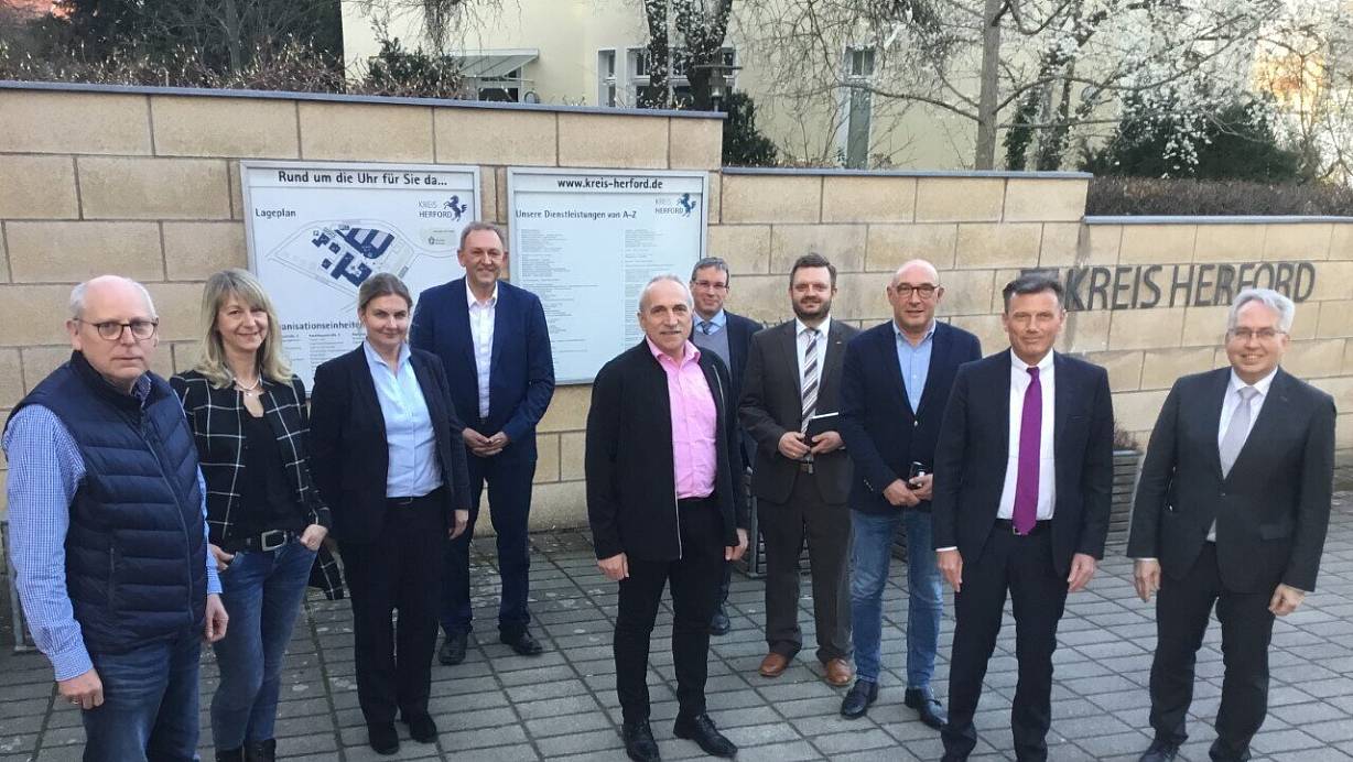 Andreas Noetzel (Vorsitzender des Personalrats des Klinikums, v.l.), Andrea Berg (Vorsitzende der Mitarbeitervertretung des Lukas-Krankenhauses), Maren Thäter und Peter Hutmacher (Klinikum-Vorstände), Ulf Dreier (stellvertretender Vorsitzender der Gesellschafterversammlung), Roland von der Mühlen (Unternehmensentwicklung Lukas-Krankenhaus), Michael Schönbeck (Vorsitzender der CDU-Kreistagsfraktion), Heinz-Georg Beneke (Vorsitzender der Gesellschafterversammlung), Wofgang Tiekötter (Vorsitzender der SPD-Kreistagsfraktion) und Landrat Jürgen Müller. | © Corina Lass