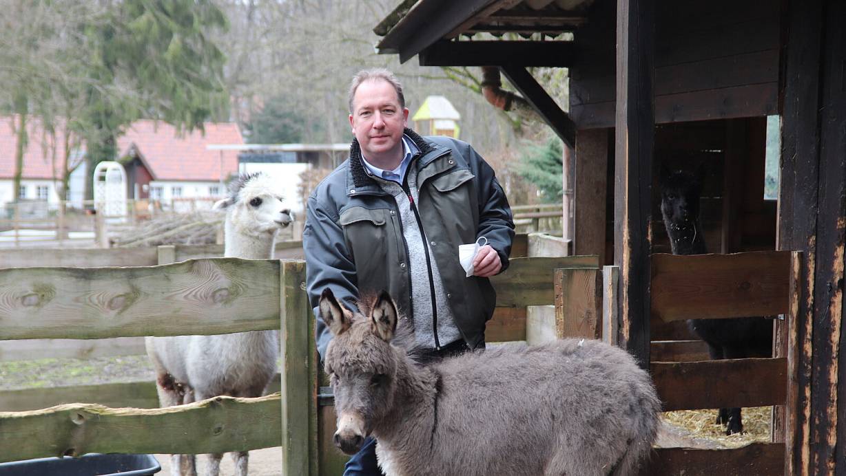 Tierparkleiter Thorsten Dodt stellt einen neuen tierischen Bewohner vor, den kleinen Esel Karl-Heinz. | © Archivbild: Alexandra Golfinger