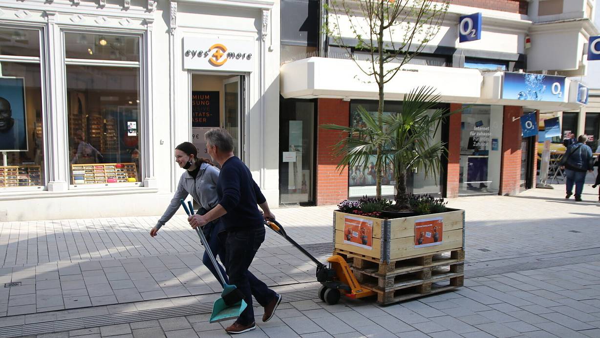 Mitarbeiter der Pro Herford ziehen die Blumenkübel in Richtung Markthalle. | © Claus Frickemeier