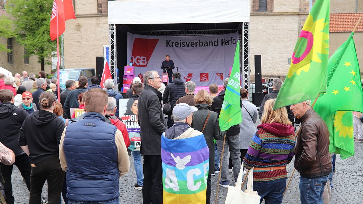Der Tag der Arbeit 2022 steht unter dem Motto „GeMAInsam Zukunft gestalten“. Auf Einladung DGB OWL gibt es eine Kundgebung auf dem Herforder Rathausplatz. | © Susanne Barth