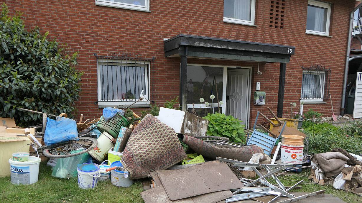 Nach dem Unwetter beginnt für die Anwohner am Bünder Fußweg das Aufräumen. Heftiger Regen hat offenbar sehr viel Schlamm durch die Straßen gespült.