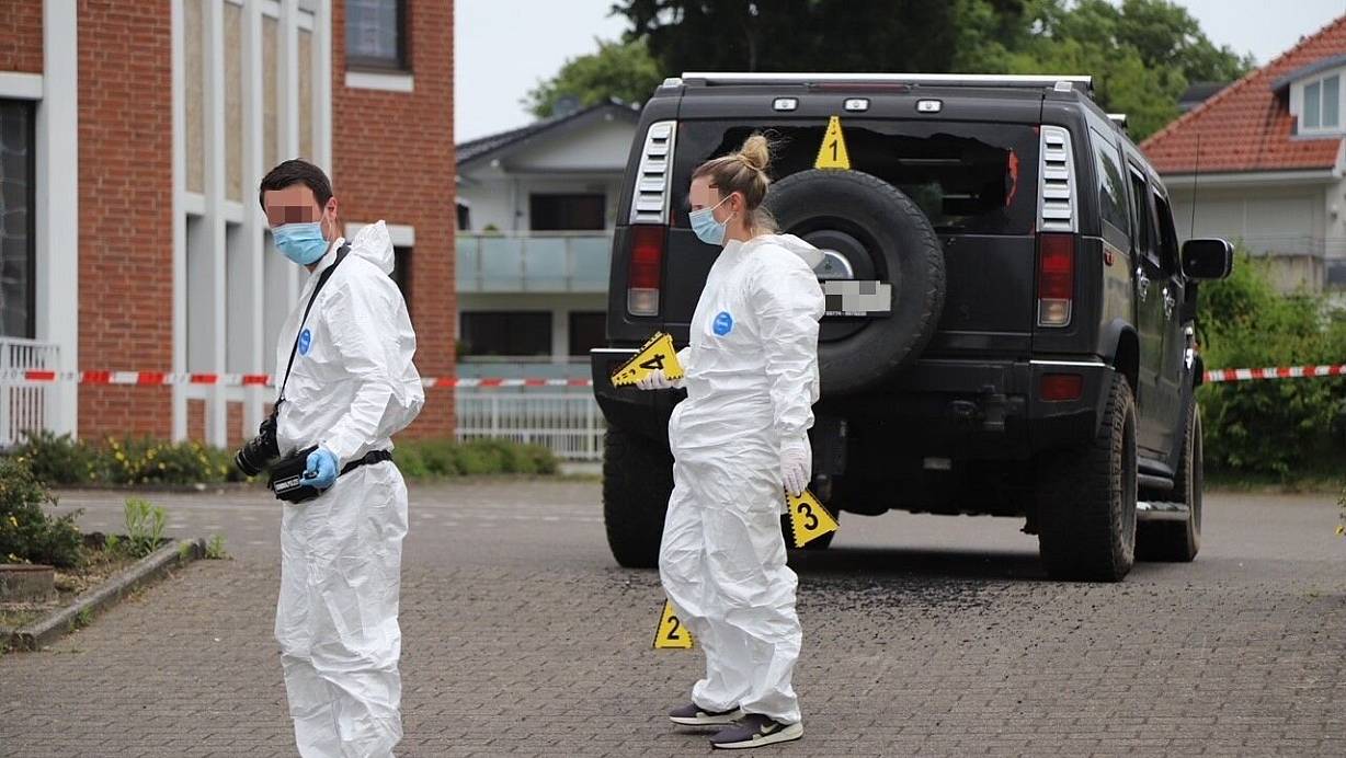 Zwei Spezialisten der Spurensicherung vor dem beschossenen Geländewagen. Zwei Einschüsse am Heck sind erkennbar, doch es soll mehrere Treffer geben. | © Charlotte Mahncke