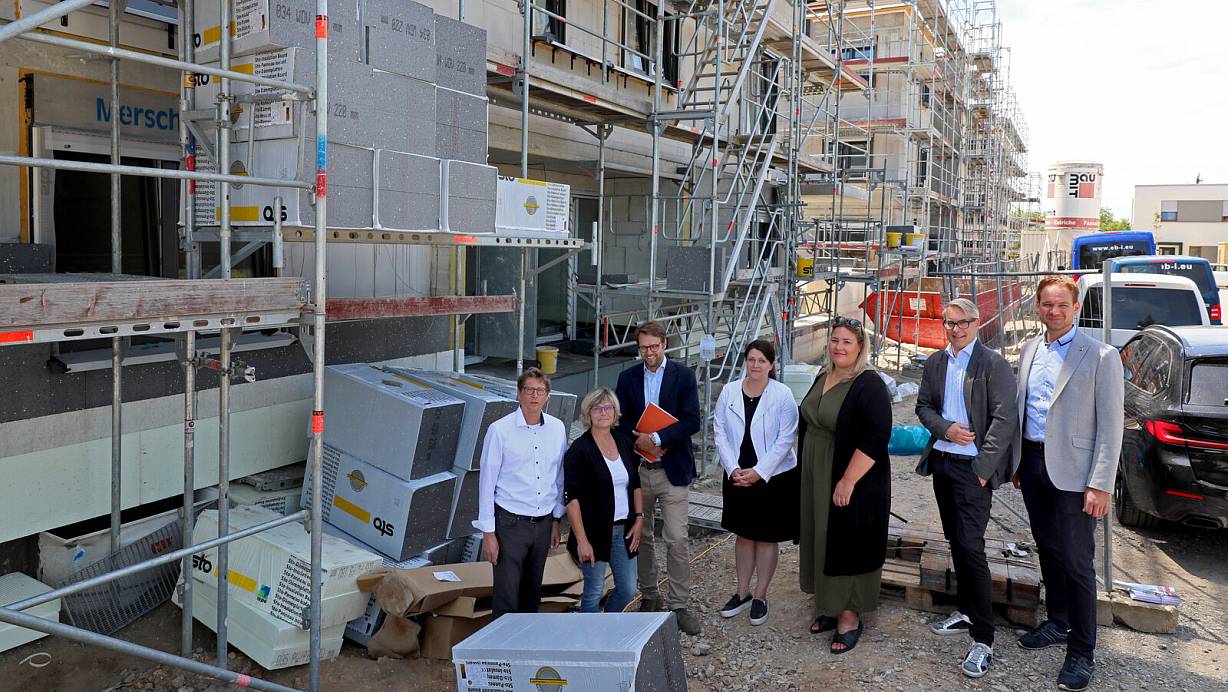 Der Regional-Geschäftsleiter Ambulante Altenhilfe im Johanneswerk Henrik Nagel-Fellerhoff, die stellvertretende Pflegedienstleitung Sylvia Müller, Bauherr Carsten Dickenbrok, die Leiterin der Hausverwaltung Sarah-Kristin Eickert, die Leiterin des ambulanten Dienstes Carmen Buchholz, Co-Bauherr Guido Strunck und AKD-Bauleiter Pascal Rieke. | © Frank-Michael Kiel-Steinkamp