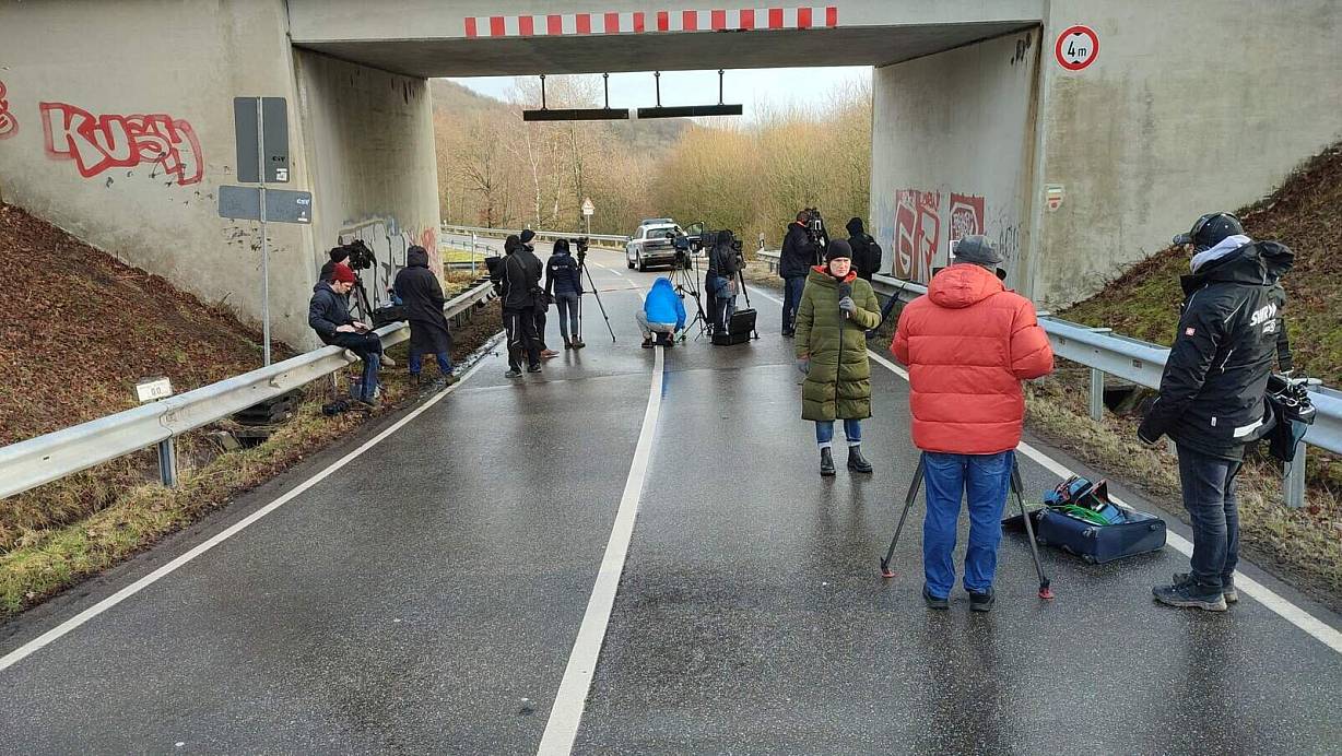 Das Medienaufkommen an der Polizeiabsperrung in der Nähe der Straße bei Kusel, an der die beiden Polizeibeamten erschossen wurden, ist groß. | © WOLFGANG STEIL/AFP