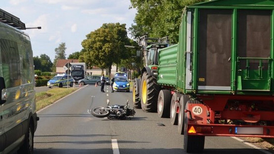 Der 55-jährige Treckerfahrer leitete daraufhin eine Vollbremsung ein, ebenso wie der Fahrer des entgegenkommenden Ford-Transits. Der Yamaha-Fahrer, der hinter ihm fuhr, konnte auf das plötzliche Bremsmanöver nicht mehr rechtzeitig reagieren. Er fuhr auf den vor Ford-Transit hinten auf und stürzte. Zum Glück verletzte er sich dabei nur leicht.
