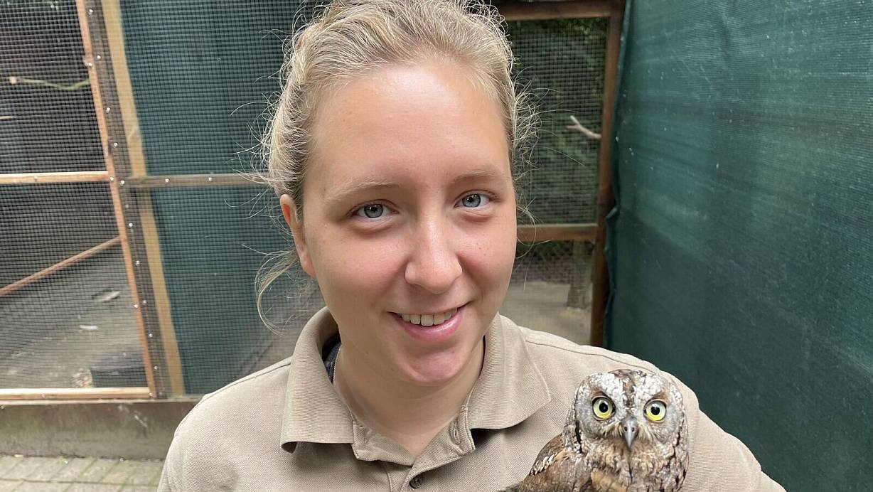 Laura Dodt und Zwergohreule Pixel: Neben den Rundgängen durch den Tierpark waren die zwei auch schon zu Gast beim Fest am Bismarckturm. Auch dort sei die kleine Eule der heimliche Star für die Besucher gewesen, erzählt Laura Dodt. | © Natalie Gottwald