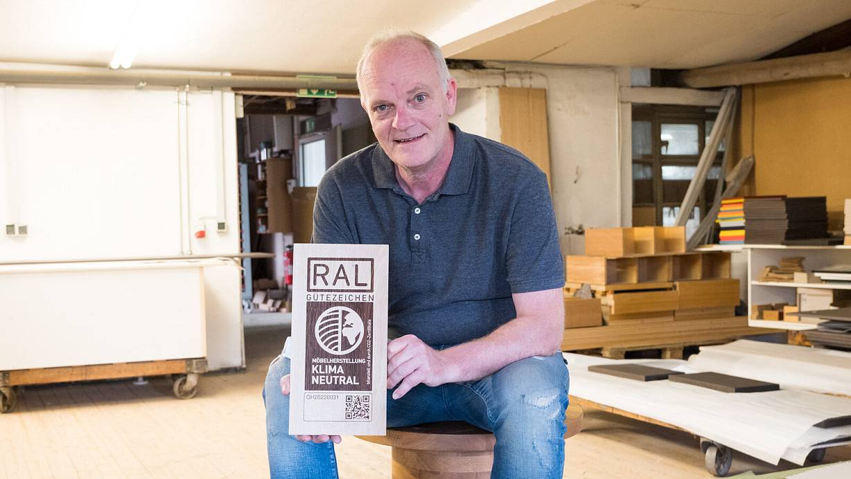 Tischlermeister Udo Knake zeigt das RAL Gütezeichen „Möbelherstellung klimaneutral“, das seiner Möbelfabrik Werner Knake als erstem Handwerksbetrieb der Branche überhaupt verliehen wurde. | © Ralf Bittner