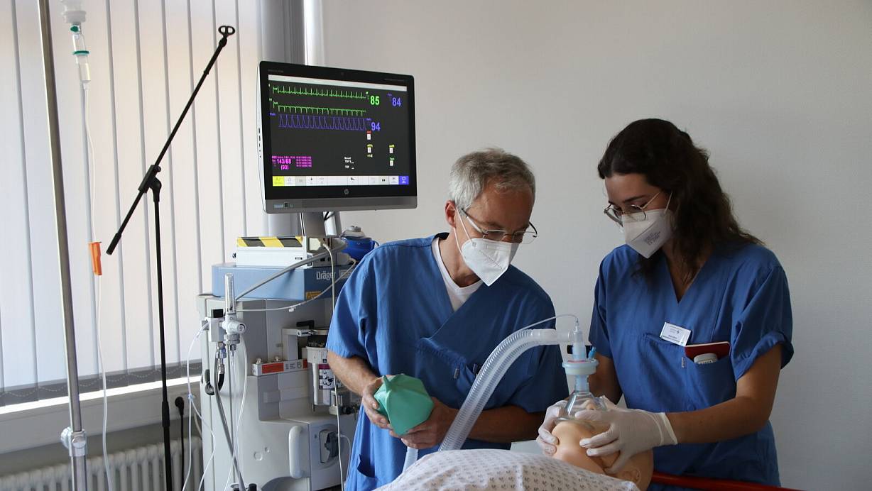 Professor Dietrich Henzler (v.l.) und Medizinstudentin Alina Hütter, die den Dummy gerade intubiert hat. | © Claus Frickemeier