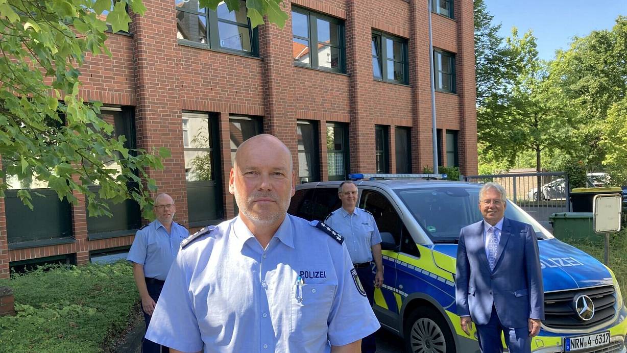 Dietmar Vogt ist neuer Leiter der Wache Nord in Herford. Hinter dem Ersten Polizeihauptkommissar stehen Polizeidirektor Uwe Köhler (v.l.), Abteilungsleiter der Polizei, Polizeidirektor Andreas Brings und Landrat Jürgen Müller. | © Jobst Lüdeking