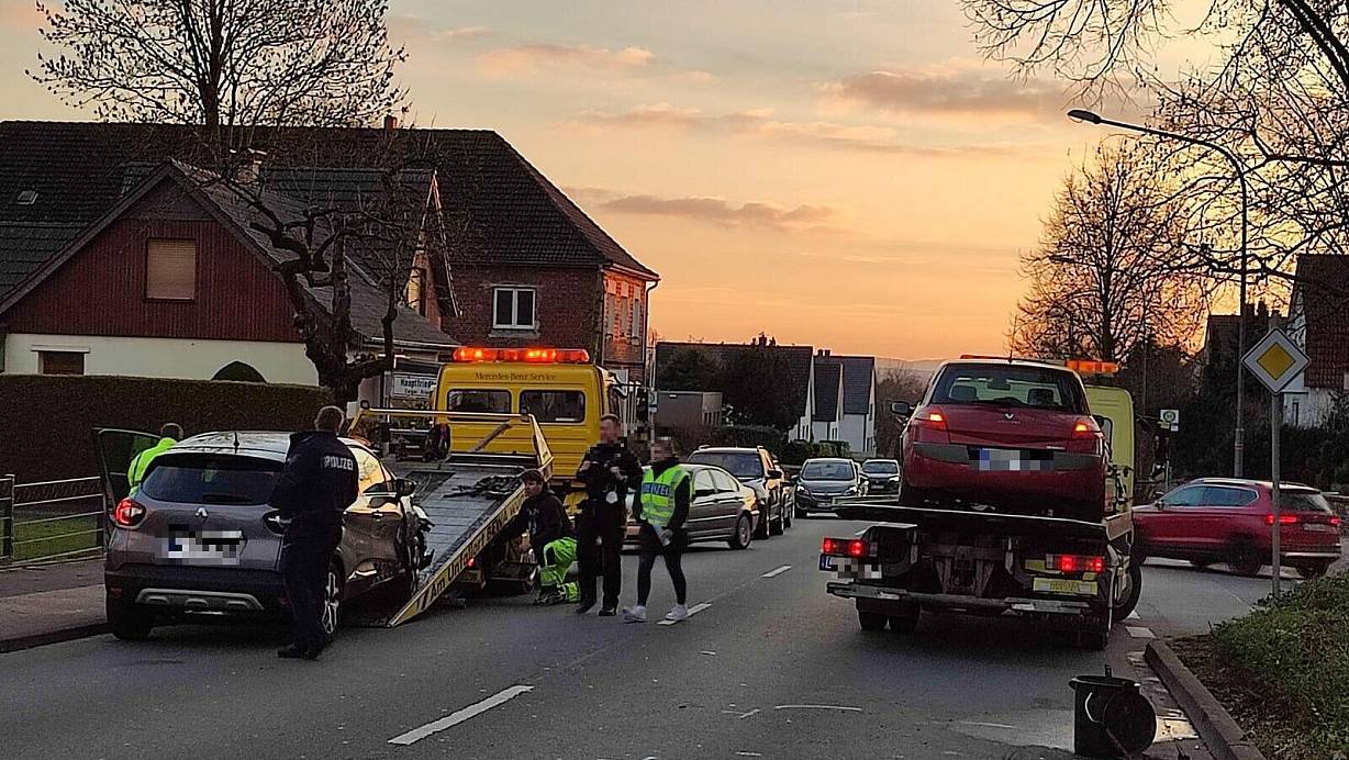 Zwei Autos kollidieren miteinander. Die Polizei und ein Rettungswagen werden gerufen. Die Straße ist kurzzeitig gesperrt.