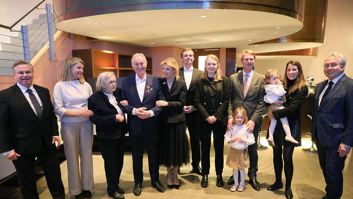Heiner Wemhöner (4.v.l.) freut sich, dass - eingerahmt von Bürgermeister Tim Kähler (l.) mit seiner Frau Sybille und Landrat Müller (r.) - mit seiner Mutter Helga, Ehefrau Elke, Kindern und Enkelkindern vier Generationen seiner Familie bei der Ordensverleihung dabei waren. | © Frank-Michael Kiel-Steinkamp