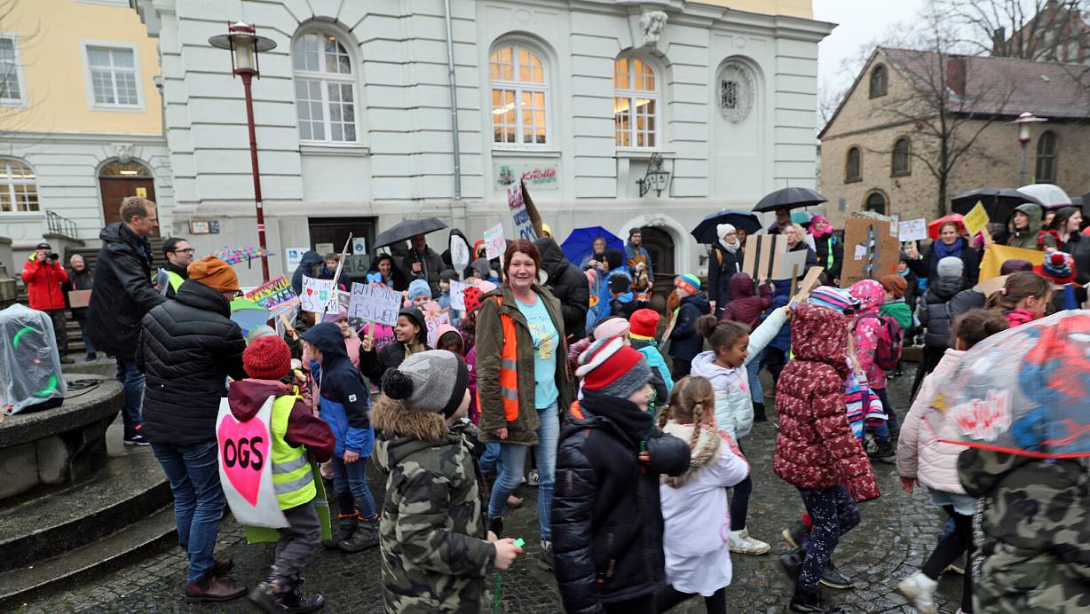 An die 300 Kinder und Erwachsene demonstrierten am Donnerstag, 23. Februar, zwischen Münsterkirche und Rathaus für die bessere finanzielle Ausstattung des Offenen Ganztags an Herforder Grundschule. | © Frank-Michael Kiel-Steinkamp
