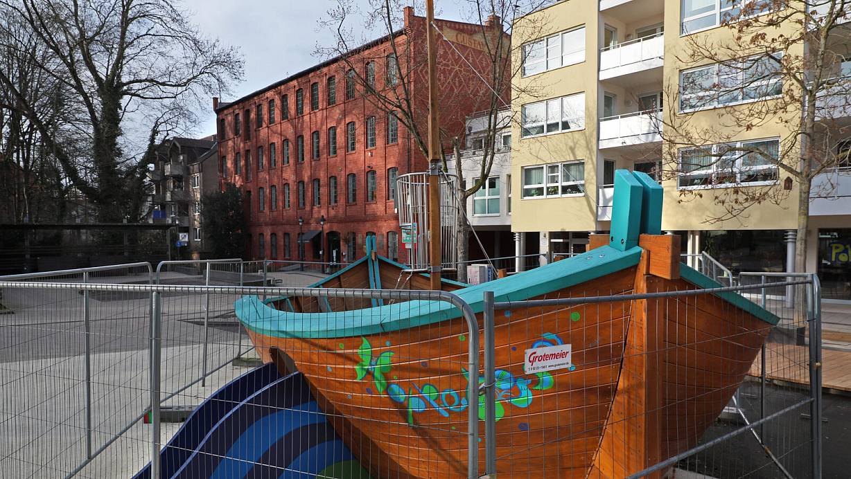 Das Spielschiff Hoppetosse auf dem Linnenbauerplatz steht noch im Bauzaun und kann nicht bespielt werden. | © Frank-Michael Kiel-Steinkamp