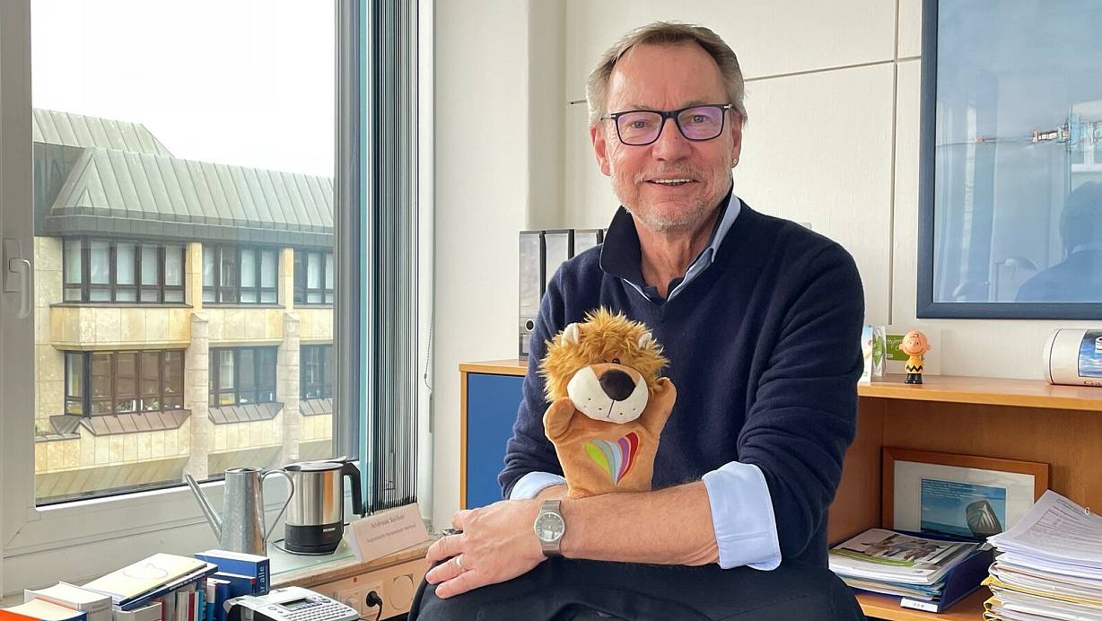 Andreas Spilker an seinem Schreibtisch, den er zum Monatsende räumt. Auf der Hand hat der Sam, den Löwen. Das ist das Maskottchen, das vom Jugendamt entwickelt wurde, um Kinder gegen sexualisierte Gewalt zu stärken. Sam steht für stark, achtsam, mutig - und Sam sagt nein. Für Spilker ist der Kinderschutz immer das zentralste Element der Arbeit im Jugendamt gewesen. | © Natalie Gottwald