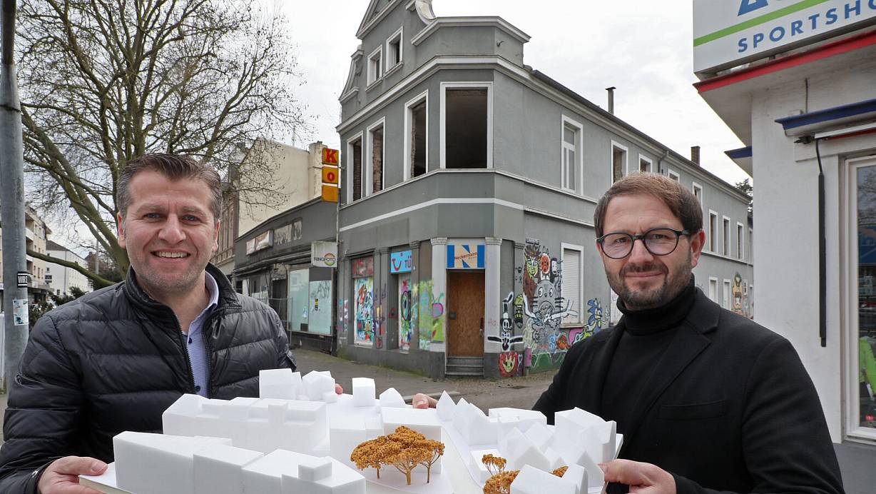 Investor Manuel Ersay und Architekt Karsten Monke von Archwerk zeigen vor dem alten Ilsemann-Gebäude ein Volumenmodell den Bauprojekts. | © Frank-Michael Kiel-Steinkamp