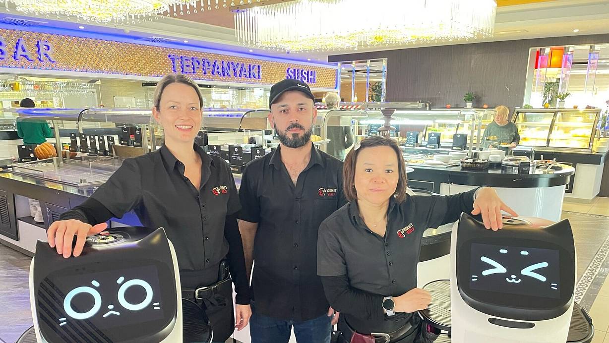 Die Service-Kräfte Claudia Peter (v.l.), Munir Semo und Truona Ngoc Nga mit ihren beiden elektronischen Kollegen im Herforder Restaurant Gourmet-World. Besonders bei den jungen Gästen sind die Service-Roboter mit den süßen, katzenähnlichen Gesichtern beliebt. | © Natalie Gottwald