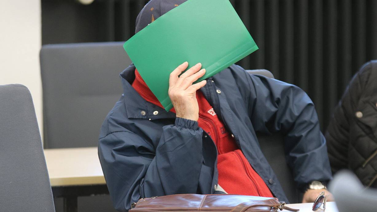 Der 75-Jährige verbirgt sein Gesicht hinter einem grünen Aktendeckel und einer dunklen Sonnenbrille. Ihm ist die Tat heute unangenehm, bei seinem Opfer hat er sich in einem Brief entschuldigt. | © Claus Frickemeier