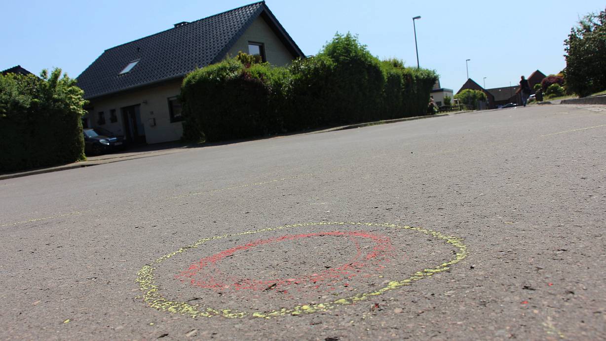 Eine von mehr als 30 Markierungen am Einsatzort in der Salzufler Sackgasse Plaßheide deutet auf die Stellen hin, an denen am Wochenende Patronenhülsen sichergestellt wurden. | © Janet König