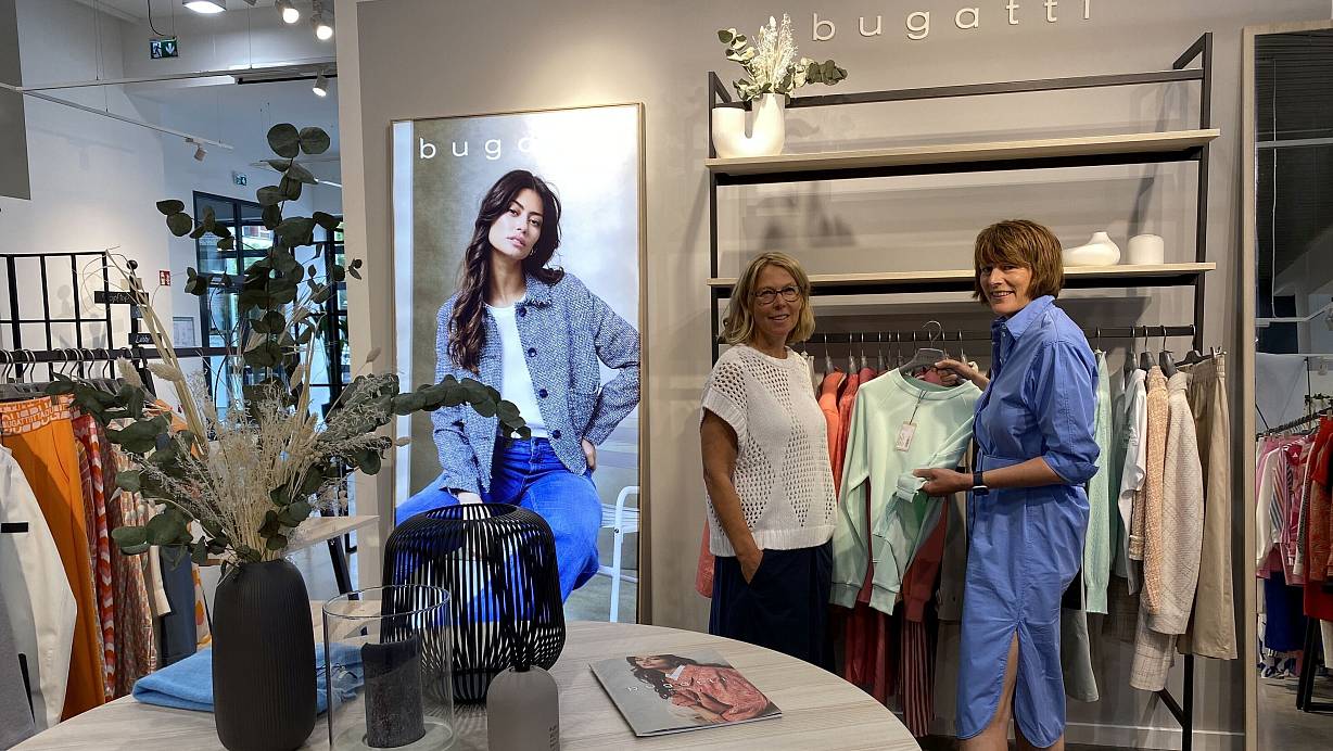 Nicole Jäger, Vertriebsleiterin Bugatti Women (l.) und Bettina Windmann, Produktmanagement Bugatti Women, zeigen die Einkäufern aus dem Handel bereits die Mode des kommenden Sommers. Die Herforder sind noch bis zum Sonntag in ihrem Showroom bei den Düsseldorfer Fashion Days. | © Bugatti