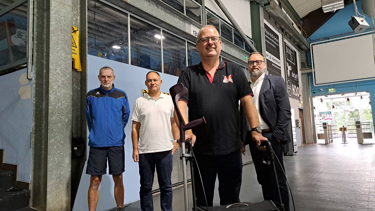Christian Henke (v.l., Leitung Freibad & Eisbahn), Markus Diering (Betriebsleiter Freizeitbetriebe der Stadtwerke), Fred Karabinski (Behindertenbeauftragter der HEV) und Patrick Puls (Beigeordneter der Stadt) freuen sich über die Umsetzung eines Behindertenbereichs (im Hintergrund) in der Eishalle Herford. | © Matthias Reiprich