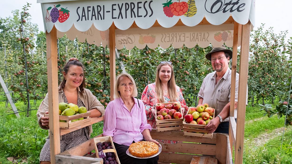 Charlotte (v. l.), Hanna und Karsten Otte hoffen mit Mitarbeiterin Stefanie Kiener (hi.) auf gutes Wetter und viele Besucherinnen und Besucher beim 27. Apfeltag auf dem Obsthof Otte. Foto: Ralf Bittner | © Ralf Bittner