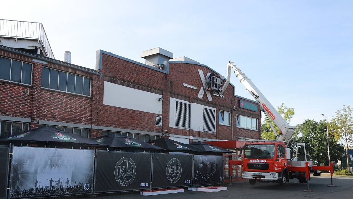 Ein Kran nimmt am Donnerstagvormittag das riesige rote X von der Fassade ab. An die Stelle soll für die Eröffnung erstmal nur ein Banner kommen. | © Claus Frickemeier