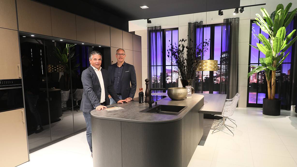 Roger Klinkenberg und Thorsten Gösling sind seit 2019 Geschäftsführer des Vlothoer Küchenmöbelherstellers Pronorm. Die organische Form der Kücheninsel wird von der Rillenfront in schwarzer Asteiche betont. | © Frank-Michael Kiel-Steinkamp