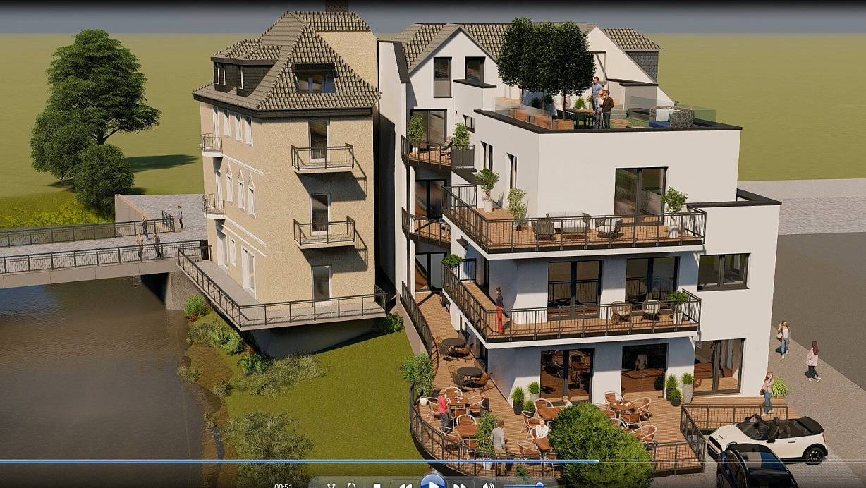 Für den gastronomischen Betrieb im Erdgeschoss des Anbaus ist eine große Terrasse geplant, die sich zur Aa hin in einem Bogen öffnet. | © Planungsbüro
