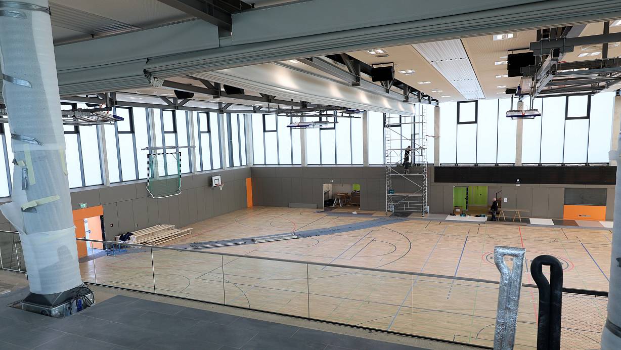 Die neue Dreifach-Sporthalle - hier auf einem Foto aus dem April - verfügt über einen Parkettboden, der nur mit Sportschuhen betreten werden darf. Er muss komplett ausgetauscht werden. | © Frank-Michael Kiel-Steinkamp