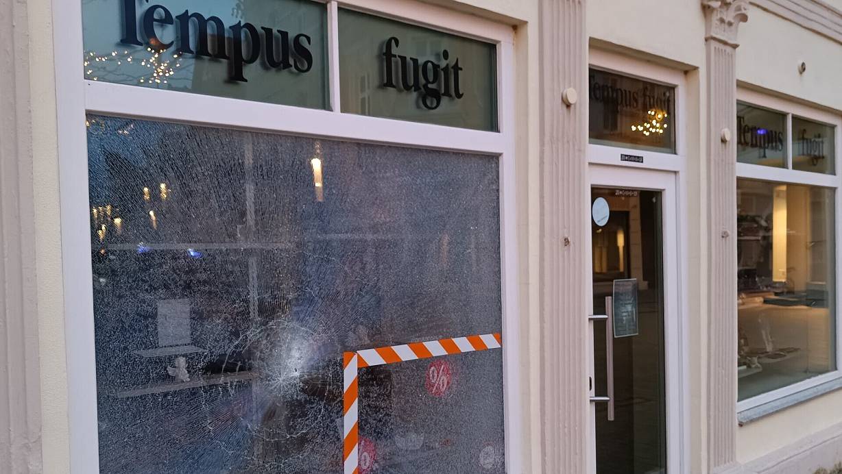 Das Sicherheitsglas des Schaufensters bei Tempus Fugit hat standgehalten, wurde jedoch arg in Mitleidenschaft gezogen. | © Claus Frickemeier