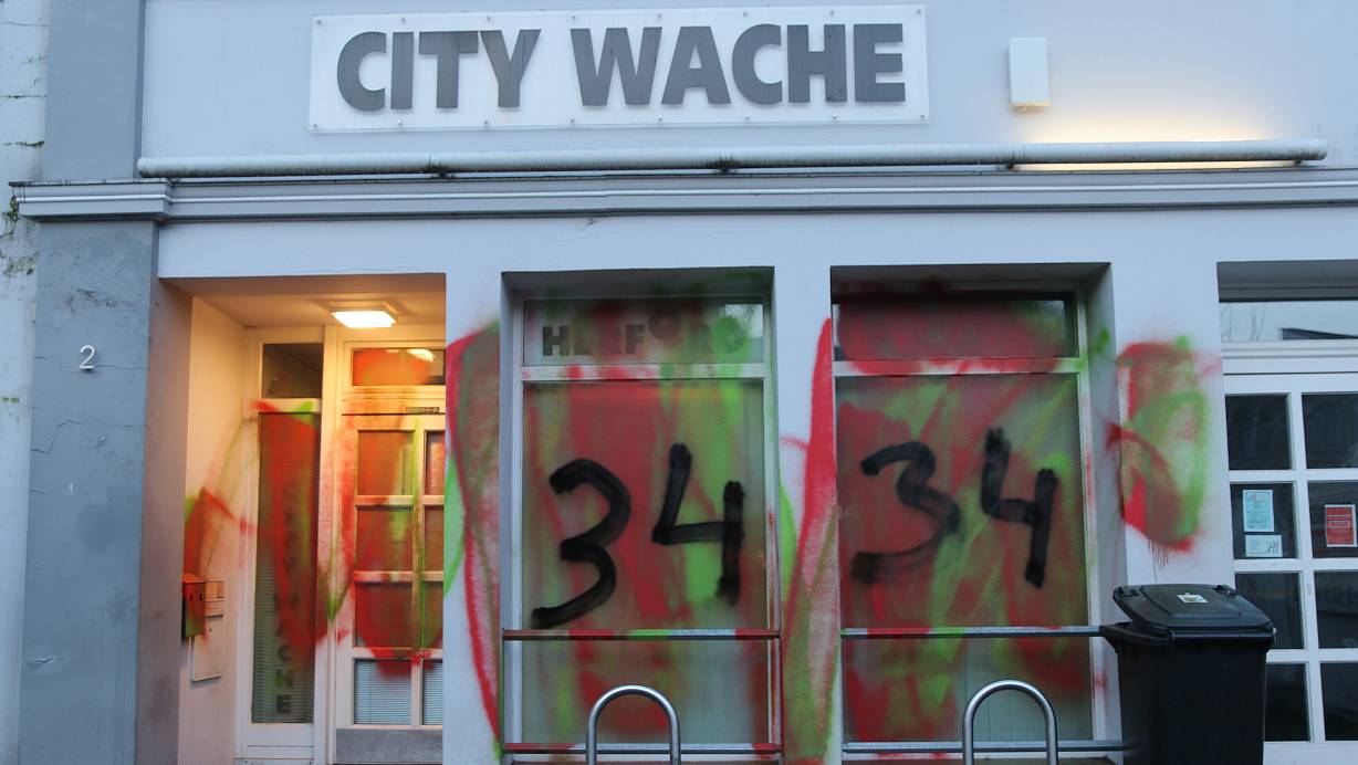 Die Citywache am frühen Morgen des 16. Februar: Unbekannte haben hier in der Zeit zwischen 2.30 und 3.15 Uhr die gesamte Front mit Farbe beschmiert. | © Claus Frickemeier