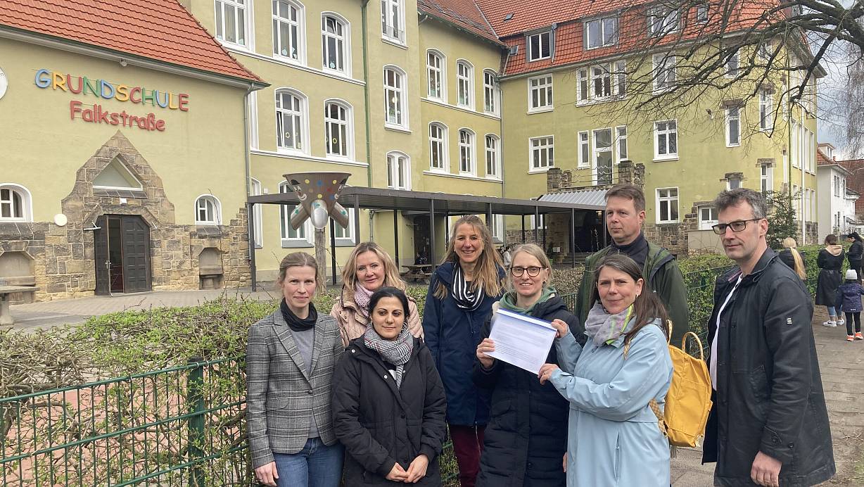 Eltern und Mitarbeiter der Schule wollen nicht mehr hinnehmen, dass Kinder durch Elterntaxis gefährdet werden, hier (v.l.) Franziska Schulte-Ostermann, Malgorzata Kehlenbrink, die den Offenen Ganztag koordiniert, Kader Meral, Schulleiterin Silke Leuchter, Doris Lummer und Kristin Biermann mit dem Schreiben an den Bürgermeister, Thorsten Mindrup und Peter Weber. | © Corina Lass