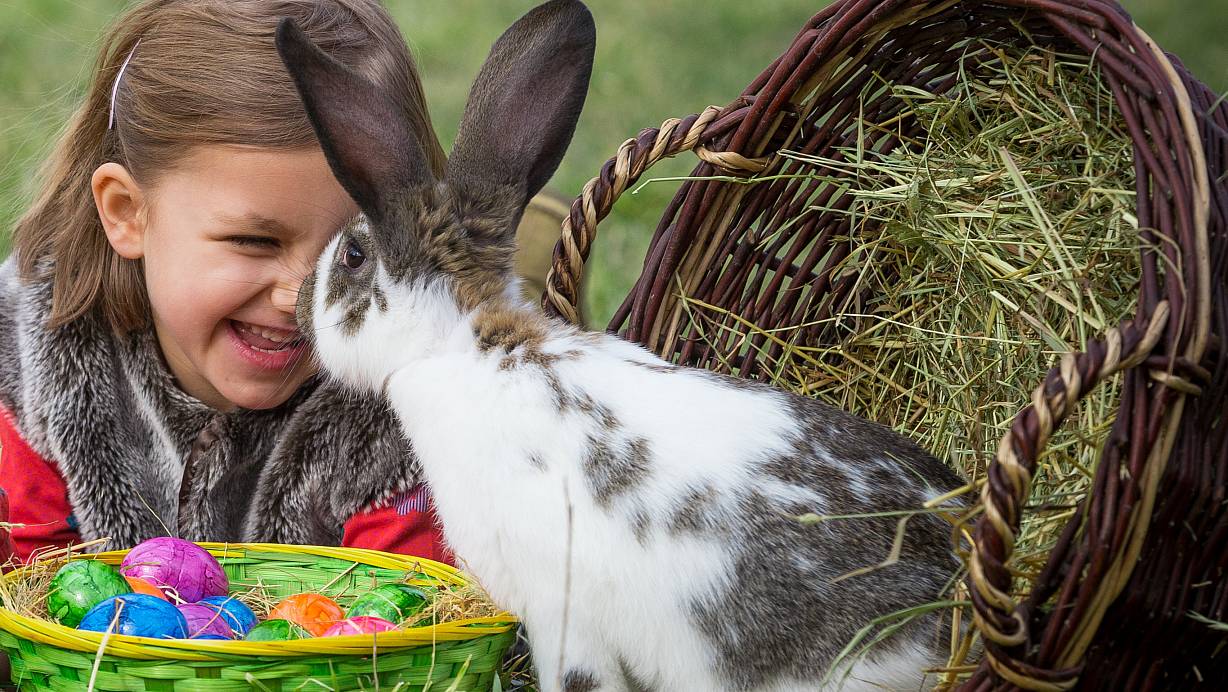 Symbolbild: In Ermangelung eines Osterhasen muss ein Kaninchen die Hasenrolle auf dem Osterfoto übernehmen und an dem Kind schnuppern. | © Patrick Pleul