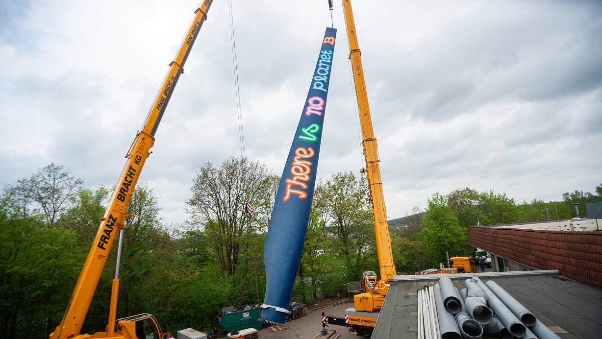 Ein alter künstlerisch gestalteter Windflügel an der „Recyclingbörse“ ist der neue Blickfang an der B 239. Der Wissenschaft dient das Kunstwerk auch.