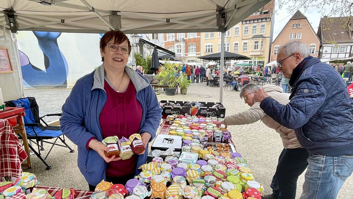 Jutta Payne aus Bünde hat einen ganzen Tisch voller selbstgemachter Marmelade auf dem Gänsemarkt aufgebaut. Die ausgefallenen Sorten wie Pina Colada, Blutorange, Birne mit Pep, Juttas Frühlingstraum oder Zitrone werden gerne probiert. | © Natalie Gottwald
