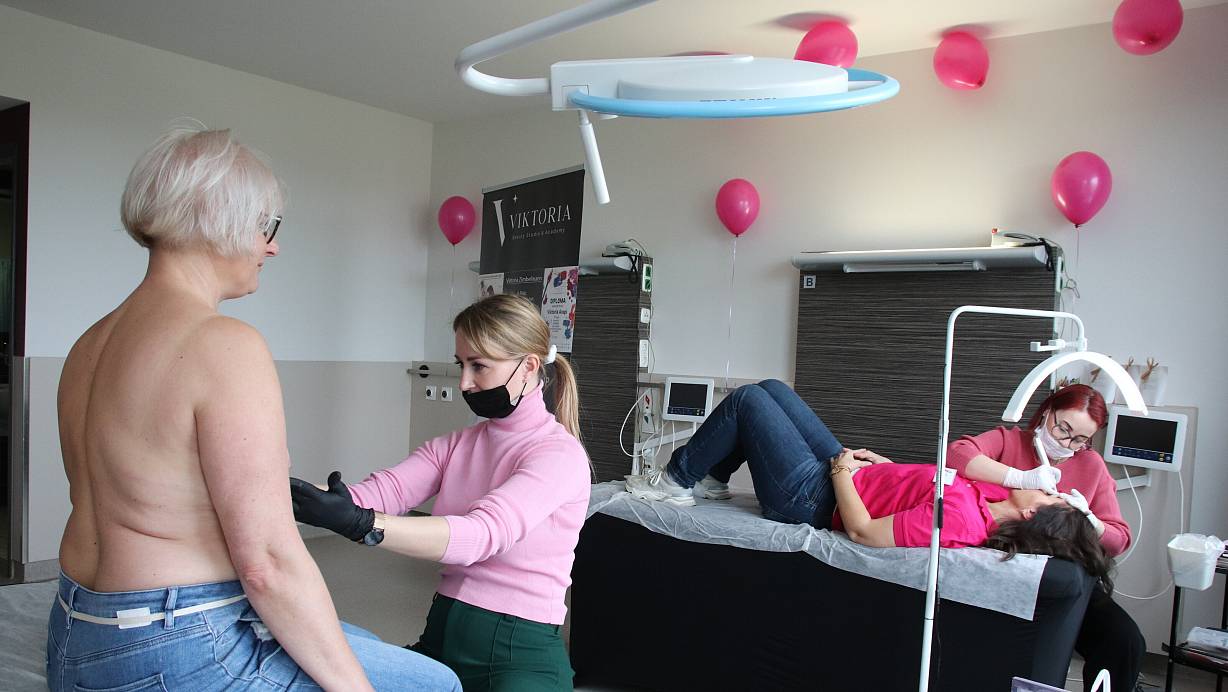 Viktoria Zimbelmann (hinten) und Alexandra Hermann tätowieren Brustkrebs-Patientinnen. | © Susanne Blersch