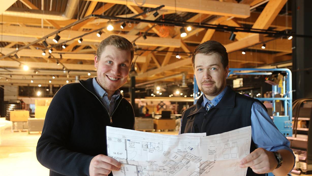 Johannes Wehrmann (26, l.) und Marktleiter Dennis Luer (31) beaufsichtigen die Innenausbauten. In drei Wochen wollen sie Eröffnung feieren. | © Claus Frickemeier