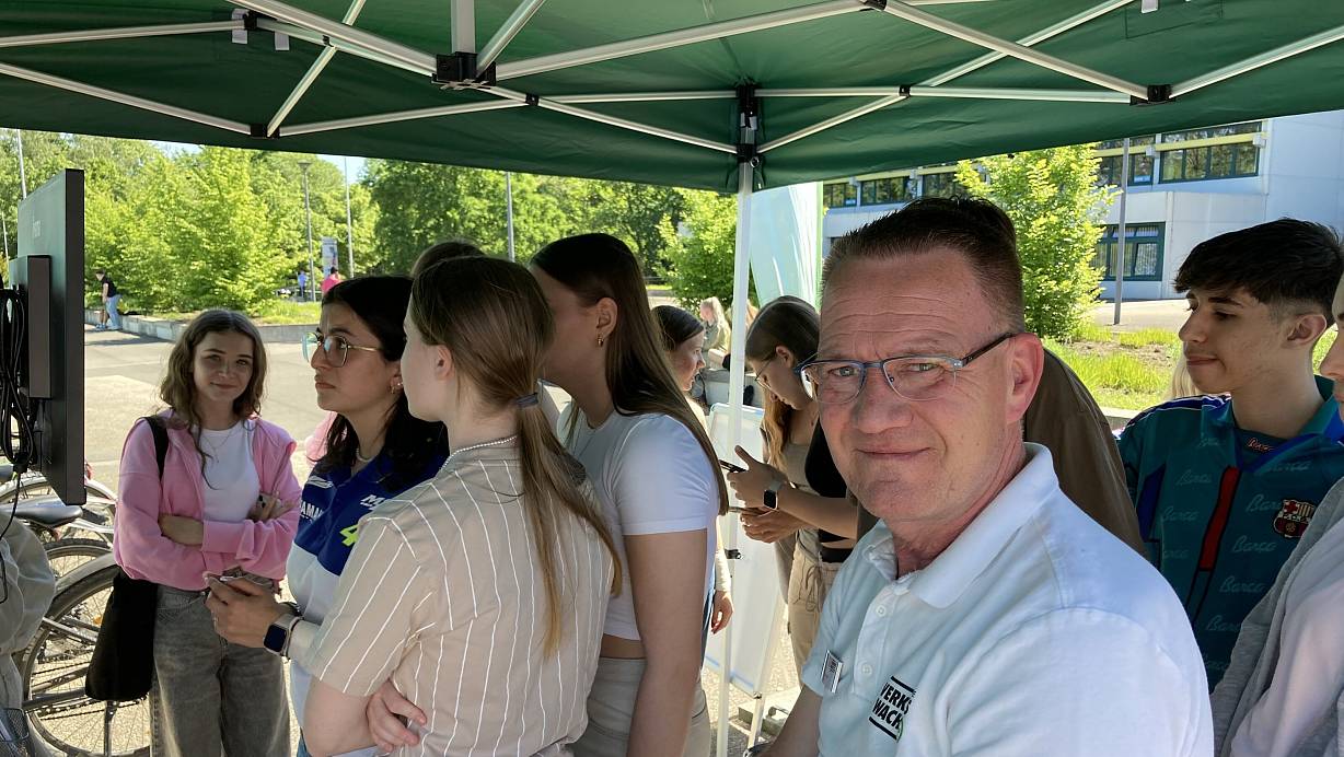Arnd Schilack betreut den Stand der Verkehrswacht, an dem eine Gruppe junger Frauen gerade versucht, gemeinsam die richtige Antwort auf die Fragen aus der theoretischen Führerscheinprüfung zu beantworten. | © Corina Lass