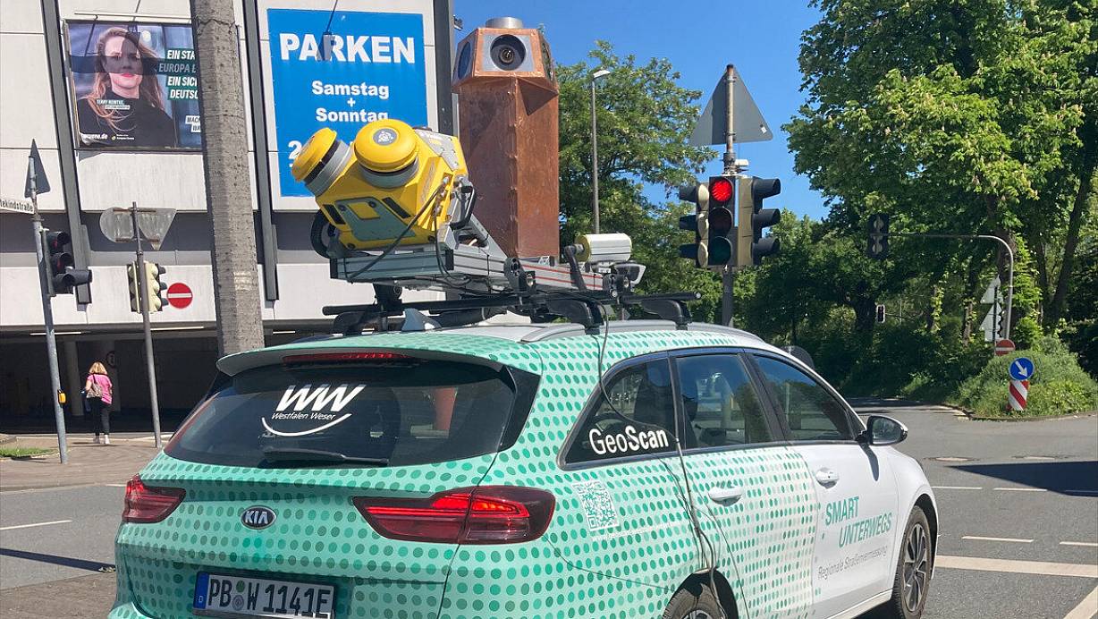 Der riesige Aufbau auf dem Fahrzeug von Westfalen Weser, hier vor dem Go-Parc in Herford, ist der 360-Grad-Kamera und dem Laserscanner geschuldet. | © Corina Lass