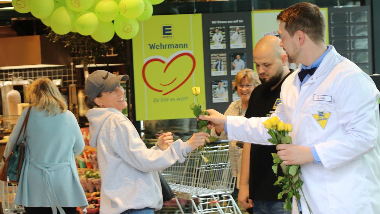 Eine Rose zur Begrüßung: Martkleiter Dennis Luer (31) stellt sich jedem einzelnen Kunden persönlich vor. | © Claus Frickemeier