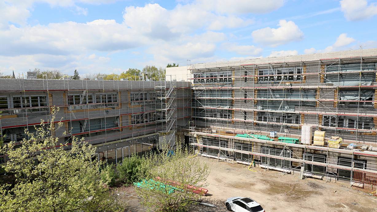 Vom Gerüst der Sporthalle ist die Baustelle Ravensberger Gymnasium im Überblick zu sehen. Das Foto entstand im April. | © Frank-Michael Kiel-Steinkamp