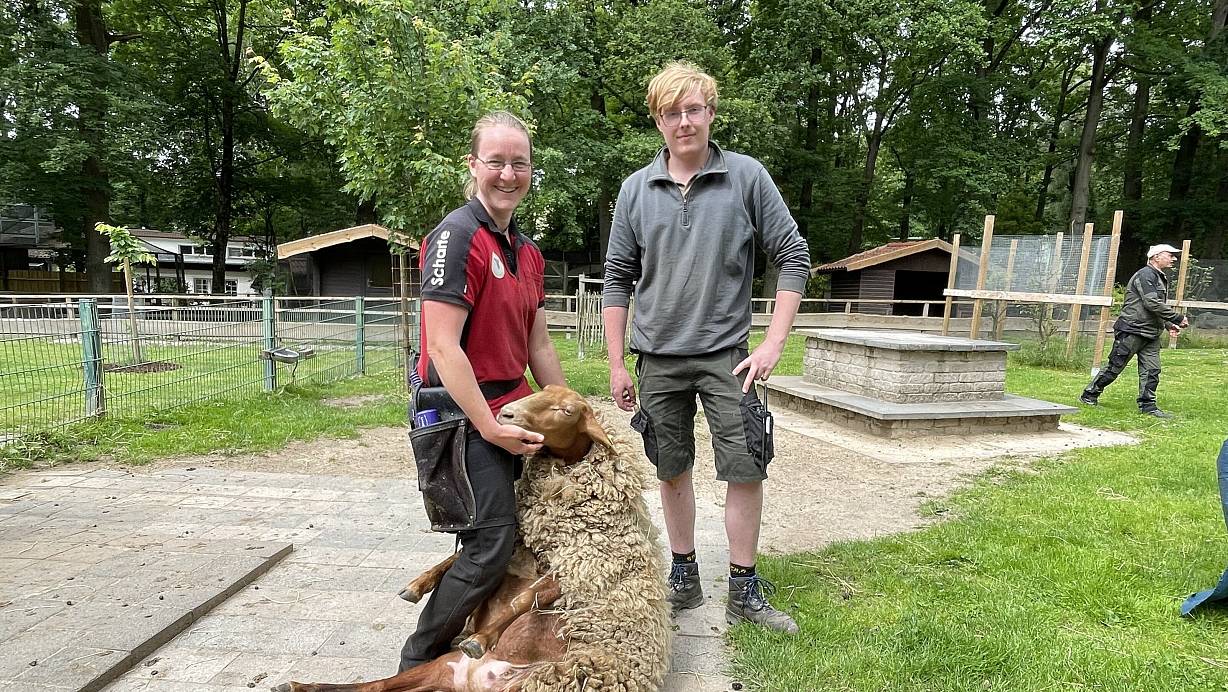Karolin Bünting aus Bad Salzuflen kümmert sich bereits zum vierten Mal darum, dass die Schafe im Tierpark Herford ihre dicke Wolle loswerden. Lukas Schweble, der gerade seine Einstiegsqualifizierung für die Ausbildung als Tierpfleger hier ableistet, hilft ihr. | © Natalie Gottwald