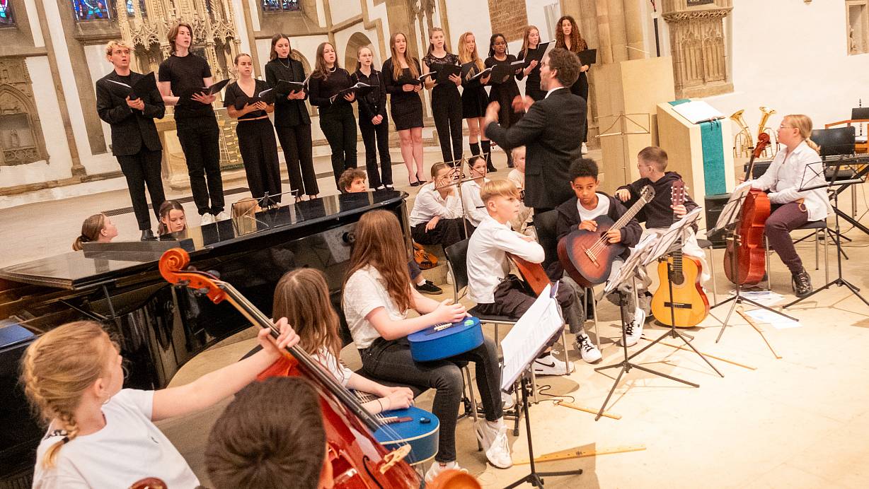 Beim Sommerkonzert des Königin-Mathilde-Gymnasiums musizieren junge Orchester und Chöre in der Marienkirche und feiern die Gemeinschaft.