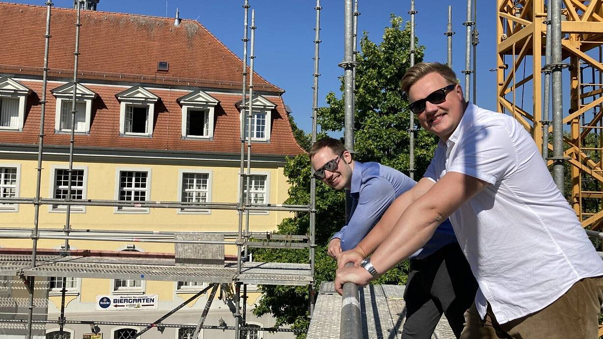Imposanter Blick mit dem Rathaus im Hintergrund: Stefan Horstmann (l.) und Ronald Klink geben einen Einblick in das Bauprojekt des Archäologischen Fensters. | © Matthias Bungeroth