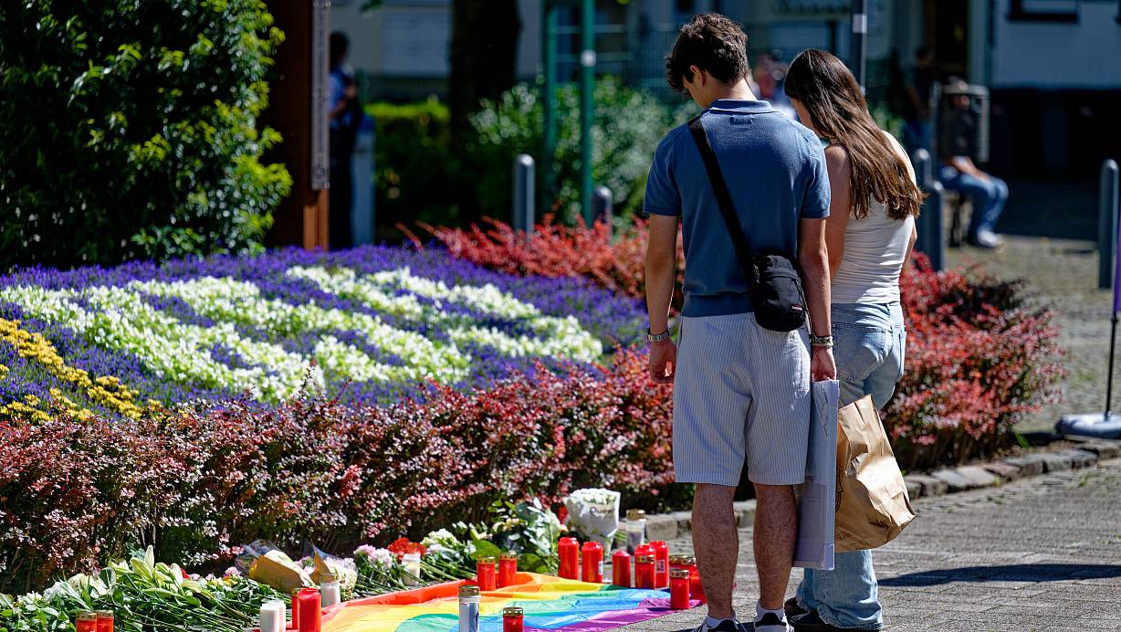24.08.2024, Nordrhein-Westfalen, Solingen: Nach der Messerattacke auf dem Solinger Stadtfest legen Menschen in der Nähe des Tatortes Blumen neben einer Regenbogenflagge nieder. Bei einer Attacke auf der 650-Jahr-Feier der Stadt Solingen hat es Todesopfer und Verletzte gegeben. Foto: Henning Kaiser/dpa +++ dpa-Bildfunk +++ | © Henning Kaiser