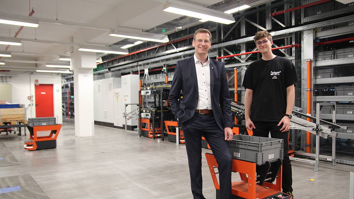 Udo Grumbach, Mitglied der Dresselhaus-Geschäftsleitung (l.), und Tobias Lechler, Projektmanager beim Roboterhersteller Safelog, zeigen die kleine Version des Roboters. Im Hintergrund ist das Behälter-Shuttle-Lager zu sehen, das auch im Zuge des Automatisierungsprozesses entstenden ist. | © Susanne Blersch