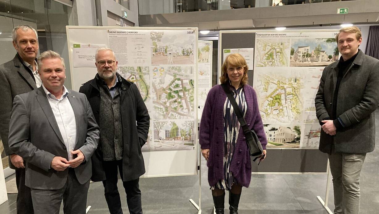 Zwei Entwürfe erhielten beim Janup-Wettbewerb den zweiten Platz. Einer von ihnen wird nun realisiert. Die besten Entwürfe werden präsentiert von Stadtbaudezernent Peter Maria Böhm, Bürgermeister Tim Kähler, Projektbetreuer | © Matthias Bungeroth