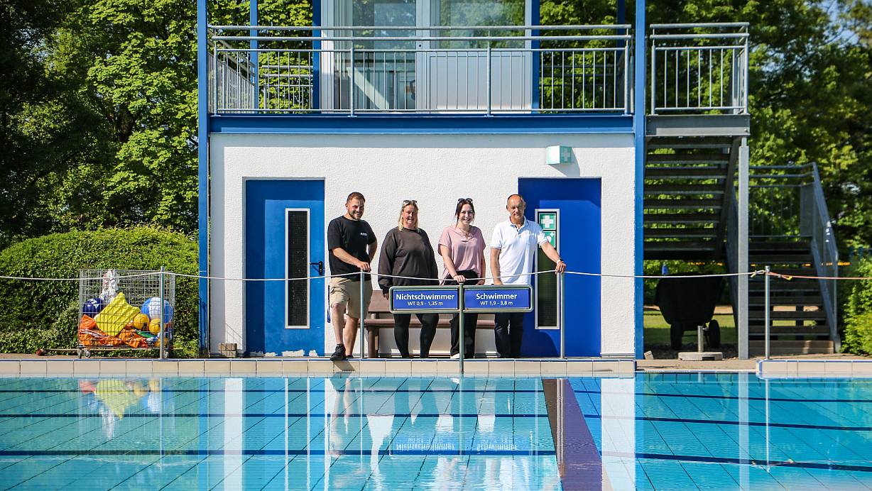 Rettungsschwimmer Ilyas Cengiz (von links), Elverdissens Badleiterin Jennifer Weiß sowie Marina Scelinski und Markus Diering hoffen auf eine tolle Freibadbadsaison in Herford. | © Daniel Salmon